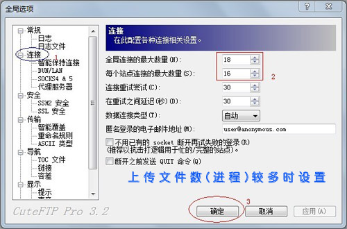 4、工具->全局选项->联接->(全局连接最大的数量、每个站点连接最大的数量)这两个地方参数设置大一点就可以了,比如设置为 16